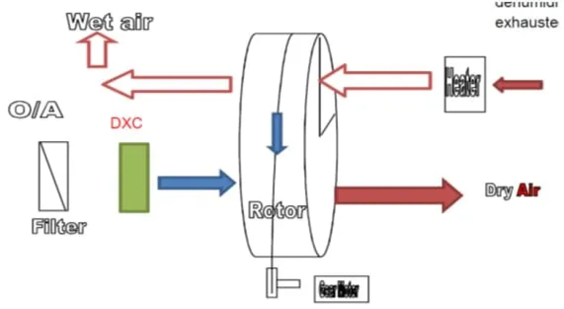 ภายในตัวเครื่องประกอบด้วยมอเตอร์พัดลมที่ใช้สำหรับดูดอากาศเข้าสู่วงล้อ โดยผ่านเครื่องทำความร้อนเพื่อให้อากาศมีอุณหภูมิสูงขึ้นถึง 130 องศาเซลเซียส เมื่อปริมาตรอากาศเคลื่อนที่ผ่านวงล้อซิลิกาเจล Rotor ซึ่งซิลิกาเจล คือ วัสดุที่สามารถดูดความชื้นจากไอน้ำในอากาศได้โดยตรง แล้วใช้ลมร้อนเป่าไล่ความชื้นออกจากซิลาเจล ที่ดูดซับความชื้นไว้ แล้วหมุนเวียนการดูด และการไล่ความชื้นอย่างต่อเนื่อง เมื่ออากาศถูกดูดความชื้นเรียบร้อยแล้วจึงปล่อยออกสู่ภายนอกเครื่อง ทั้งนี้สามารถลดฝุ่นละอองภายในอากาศได้ด้วยแผ่นกรองหยาบภายในตัวเครื่อง ดังรูป กระบวนการลดความชื้นสามารถทำงานได้ดีในช่วงอุณหภูมิ -30 ถึง 40 องศาเซลเซียส