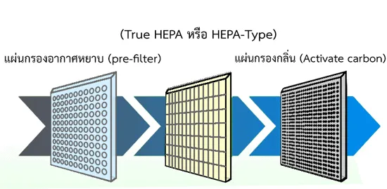 -เครื่องฟอกอากาศ ประกอบด้วยแผ่นกรองอากาศหยาบ (pre-filter) ทำหน้าที่กรองอนุภาคขนาดใหญ่ที่ลอยอยู่ในอากาศ แผ่นกรองอากาศประสิทธิภาพสูง (True HEPA หรือ HEPA-Type) ทำหน้าที่กรองอนุภาคที่มีขนาดเล็กกว่า 0.3 ไมครอน และอาจมีแผ่นกรองที่มีประสิทธิภาพในการกรองกลิ่น ด้วยแผ่นกรองกลิ่น (Activate carbon) เป็นต้น