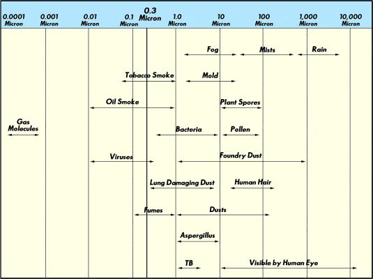 ขณะที่มาตราฐานของสหรัฐอเมริกาได้ใช้อนุภาคขนาด 0.3 ไมครอนในการอธิบายประสิทธิภาพของแผ่นกรอง ซึ่งอนุภาคขนาดนี้เป็นอนุภาคที่กรองได้ยาก แผ่นกรอง HEPA สร้างขึ้นจากเส้นใยที่จัดเรียงกันไม่เป็นระเบียบเหมือนใยแมงมุมอย่างหนาแน่น เมื่ออากาศไหลผ่านจะดักจับอนุภาค และกักเก็บไว้ข้างในเส้นใย