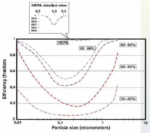 การทำความเข้าใจทั้งสามวิธีทำให้มันชัดเจนว่าทำไมอนุภาคประมาณ 0.3 ไมโครเมตรจึงยากที่สุดในการกรอง อนุภาคน้อยกว่า 0.1 ไมโครเมตรติดได้ง่ายเนื่องจากการกระจายในขณะที่อนุภาคขนาดใหญ่กว่า 0.4 ไมโครเมตรถูกขังอยู่โดยความเฉื่อย และการสกัดกั้นที่มีประสิทธิภาพ เพื่อให้ประสิทธิภาพของตัวกรองลดลงในช่วงนี้ โดยระบุประสิทธิภาพแผ่นกรอง HEPA ที่ 0.3 ไมโครเมตรร่างมาตรฐานจริงๆอธิบายที่แตกต่างของประสิทธิภาพขั้นต่ำของตัวกรอง