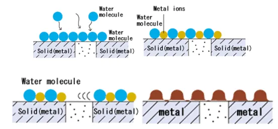-พื้นผิวของของแข็งถูกจ่ายศักย์ไฟฟ้าให้ ไอออนของผิวโลหะเริ่มหลุดออกมาในขั้นตอนนี้