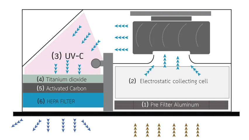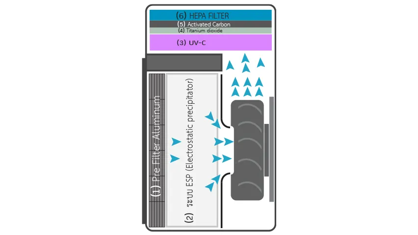 การทำงานร่วมกันของระบบ ESP, TiO2 และ UV , Activated Carbon, HEPA ทำงานประสานกันในหลายขั้นตอนเพื่อให้ได้ผลลัพธ์ที่ดีที่สุด: